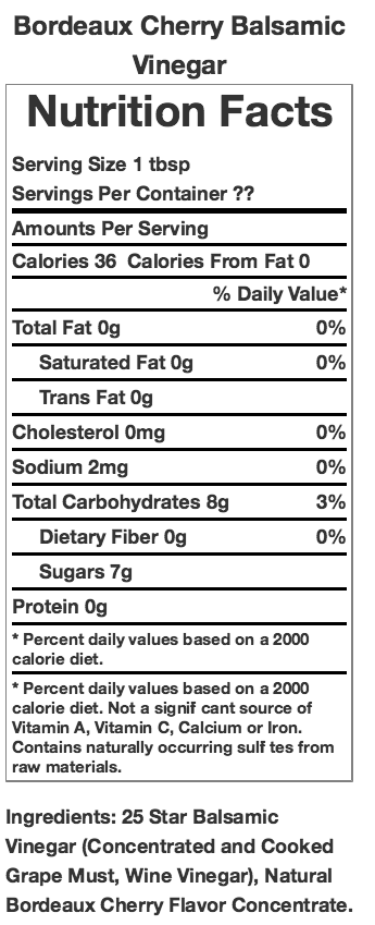 Beautiful, dark, ripe Bordeaux Cherry flavor enlivens this incredible Italian aged balsamic. Use as a glaze for roasted chicken, or pork. Use as a dip for your biscotti, drizzle over oatmeal for breakfast... or Try it on Ice Cream!