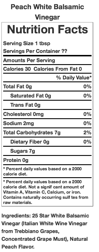 Delightfully aromatic with the truest of peach flavors. If you like peach, you'll love this white balsamic vinegar. Blend with fresh raspberries and cream cheese or with our savory basil infused olive oil for a delightful dipping sauce.