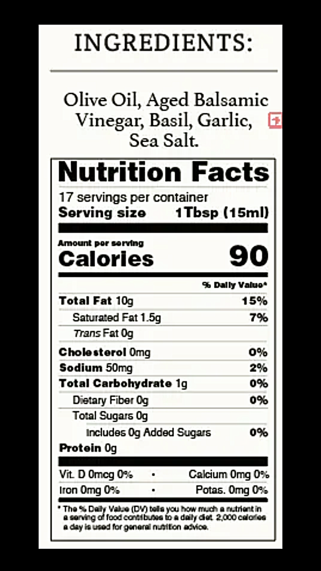 Olive Oil, Aged Balsamic Vinegar, Basil, Garlic, Sea Salt.