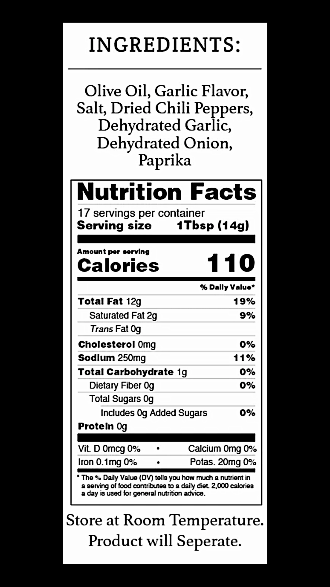 Olive Oil, Garlic Flavor, Salt, Dried Chili Peppers, Dehydrated Garlic, Dehydrated Onion, Paprika.